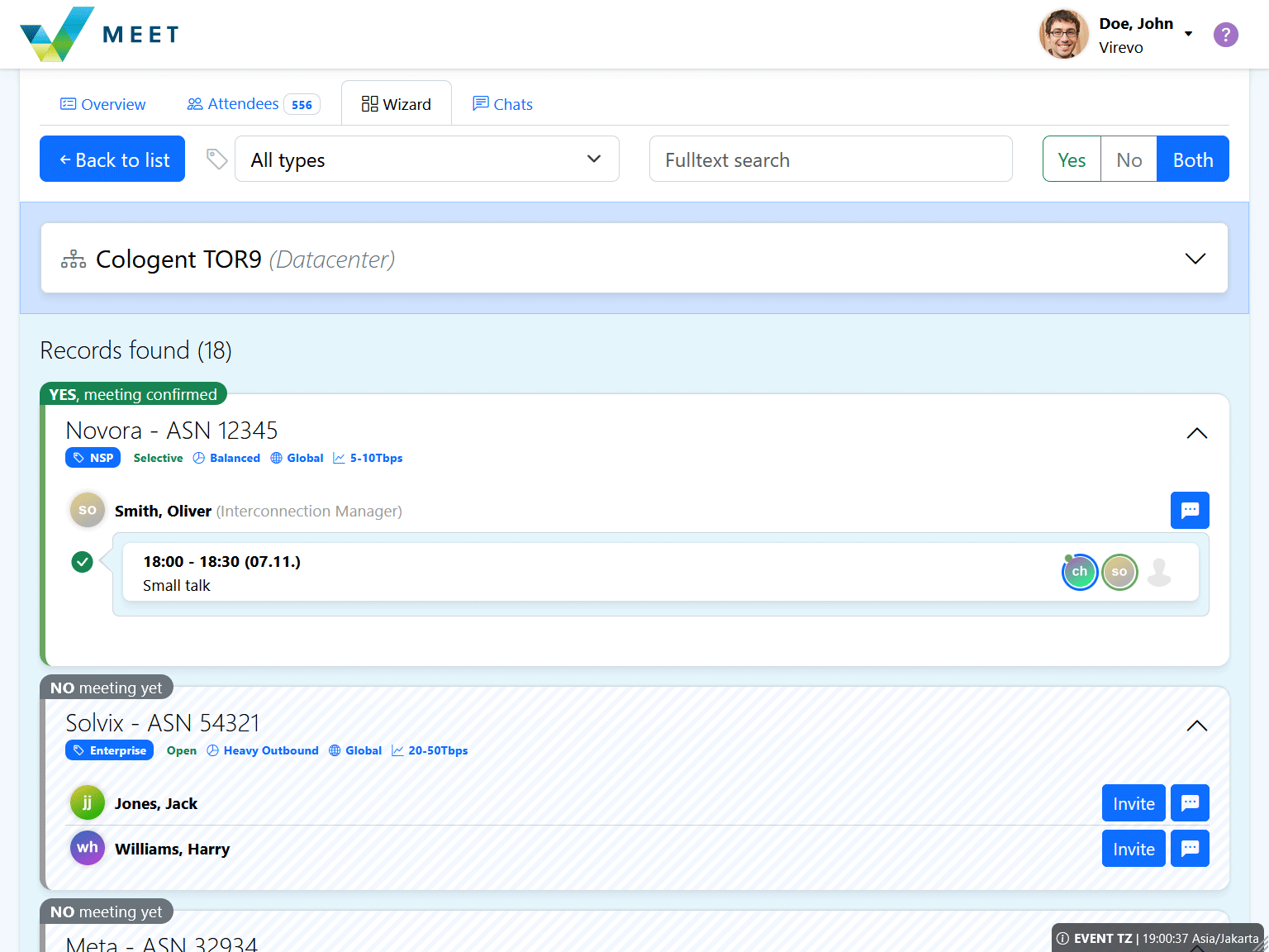 - Nově Wizard - propojuje kontakty z PeeringDB s registracemi uživatelů. Přehled o firmách a jejich zástupcích, se kterými se plánujete během eventu setkat.