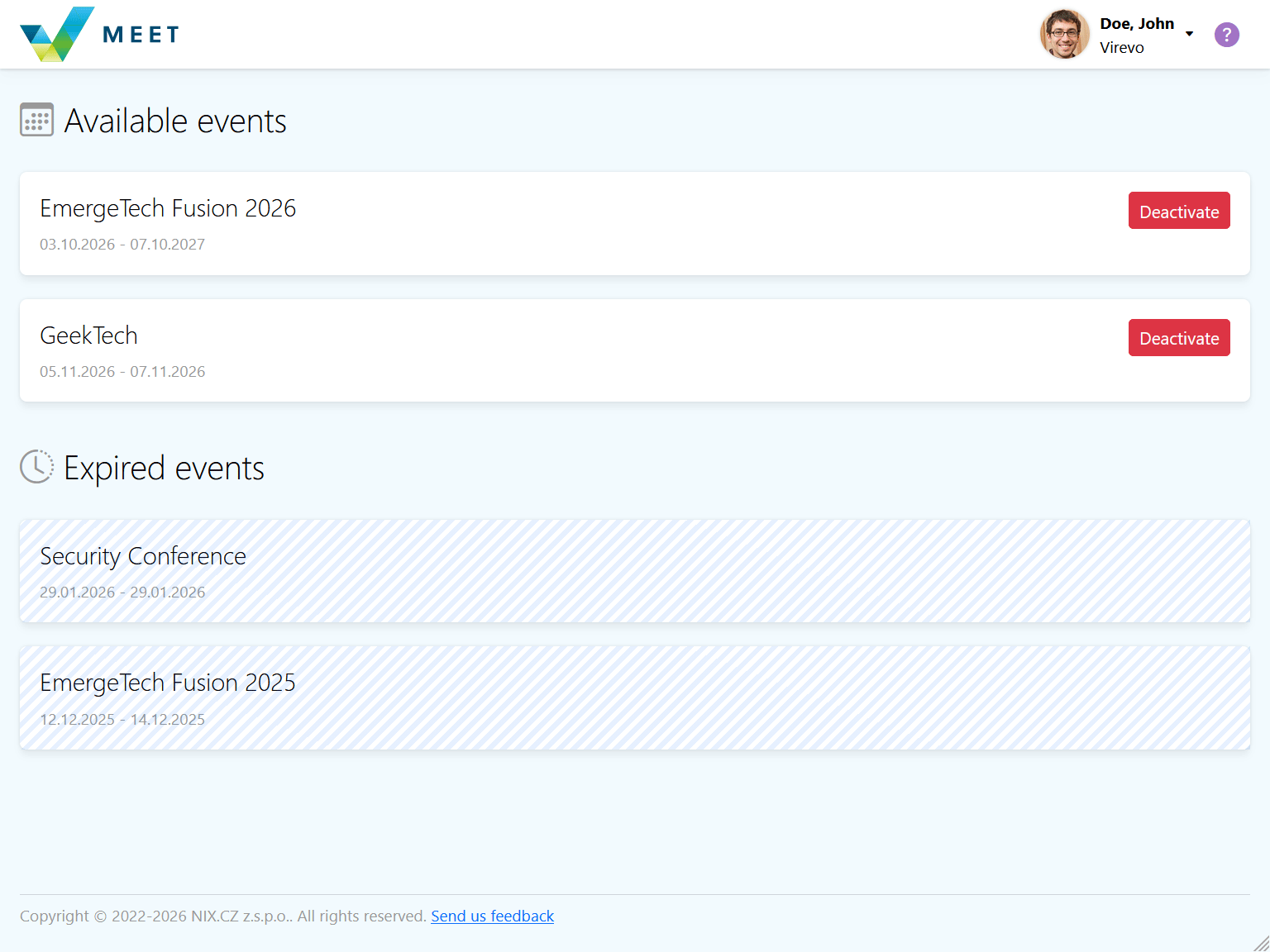 - Seznam účastníků s informací o dostupnosti přímo v den konference dle potvrzeného check-in s možností fulltextového vyhledávání a filtrování